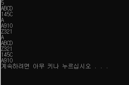 첫째 줄부터 차례대로 N개의 줄에 한줄에 하나씩 시리얼 번호를 정렬한 결과를 출력한다.