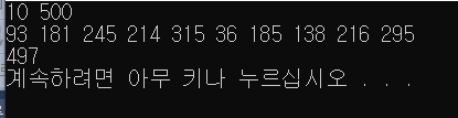 첫째 줄에 카드의 개수 N(3 ≤ N ≤ 100)과 M(10 ≤ M ≤ 300,000)이 주어진다. 둘째 줄에는 카드에 쓰여 있는 수가 주어지며, 이 값은 100,000을 넘지 않는다.