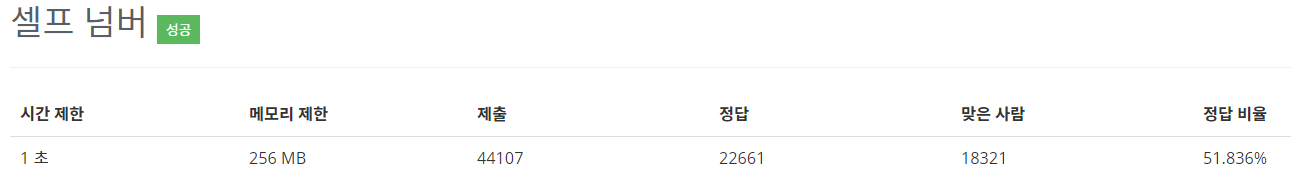 문제 셀프 넘버는 1949년 인도 수학자 D.R. Kaprekar가 이름 붙였다. 양의 정수 n에 대해서 d(n)을 n과 n의 각 자리수를 더하는 함수라고 정의하자. 예를 들어, d(75) = 75+7+5 = 87이다. 양의 정수 n이 주어졌을 때, 이 수를 시작해서 n, d(n), d(d(n)), d(d(d(n))), ...과 같은 무한 수열을 만들 수 있다. 예를 들어, 33으로 시작한다면 다음 수는 33 + 3 + 3 = 39이고, 그 다음 수는