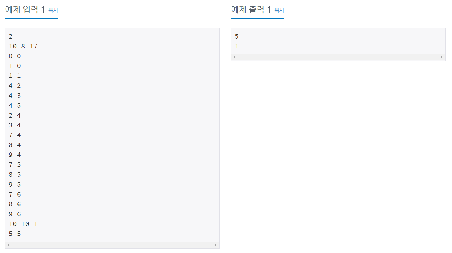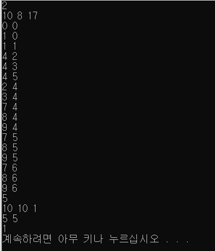 입력의 첫 줄에는 테스트 케이스의 개수 T가 주어진다. 그 다음 줄부터 각각의 테스트 케이스에 대해 첫째 줄에는 배추를 심은 배추밭의 가로길이 M(1 ≤ M ≤ 50)과 세로길이 N(1 ≤ N ≤ 50), 그리고 배추가 심어져 있는 위치의 개수 K(1 ≤ K ≤ 2500)이 주어진다. 그 다음 K줄에는 배추의 위치 X(0 ≤ X ≤ M-1), Y(0 ≤ Y ≤ N-1)가 주어진다.