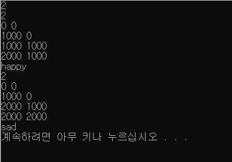 각 테스트 케이스에 대해서 상근이와 친구들이 행복하게 페스티벌에 갈 수 있으면 "happy", 중간에 맥주가 바닥나면 "sad"를 출력한다.