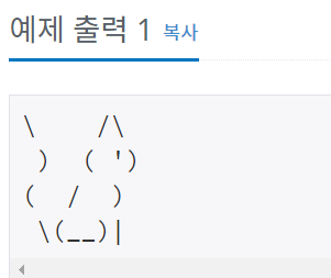 문제 아래 예제와 같이 고양이를 출력하시오. 입력 출력 고양이를 출력한다. 예제 입력 1 복사 예제 출력 1 복사 \ /\ ) ( ') ( / ) \(__)|...