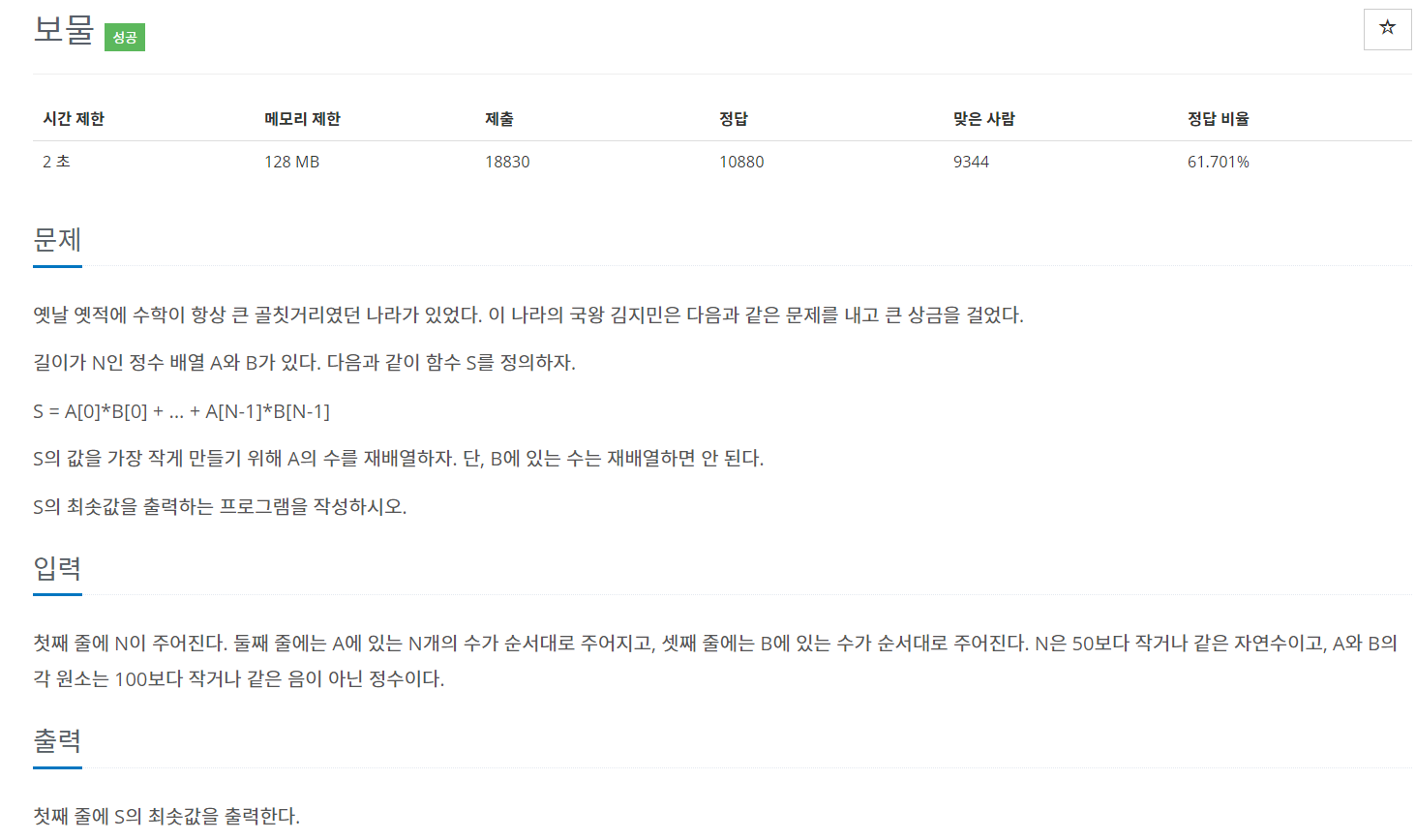따라서 A는 내림차순으로 정렬하고 B는 오름차순으로 정렬한 후 각 인덱스의 수의 곱한 결과의 합이 최소값이 된다.