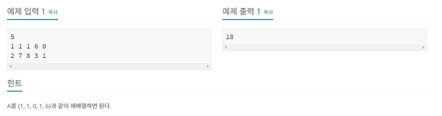 S의 값을 가장 작게 만들기 위해 A의 수를 재배열하자. 단, B에 있는 수는 재배열하면 안 된다.