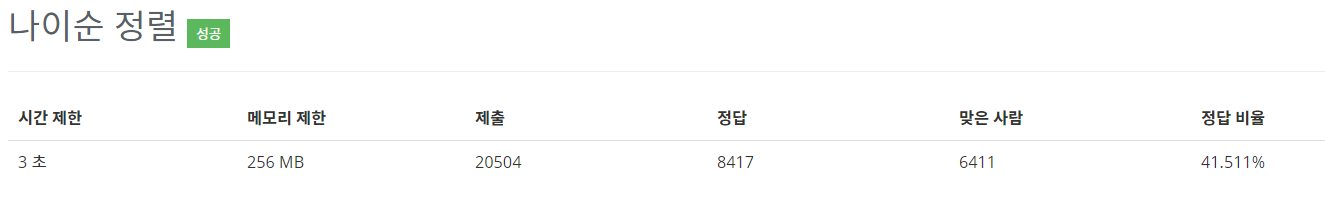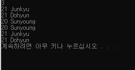 첫째 줄부터 총 N개의 줄에 걸쳐 온라인 저지 회원을 나이 순, 나이가 같으면 가입한 순으로 한 줄에 한 명씩 나이와 이름을 공백으로 구분해 출력한다.