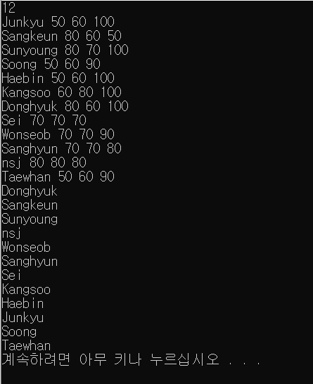 첫째 줄에 도현이네 반의 학생의 수 N (1 ≤ N ≤ 100,000)이 주어진다. 둘째 줄부터 한 줄에 하나씩 각 학생의 이름, 국어, 영어, 수학 점수가 공백으로 구분해 주어진다. 점수는 1보다 크거나 같고, 100보다 작거나 같은 자연수이다. 이름은 알파벳 대소문자로 이루어진 문자열이고, 길이는 10자리를 넘지 않는다.