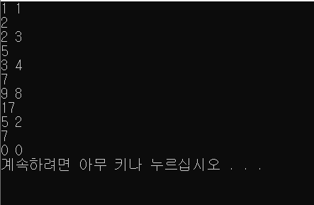 그래서 무한반복문을 돌리다가 a가 0이고, b도 0이면 break;해서 반복문을 빠져나온다.