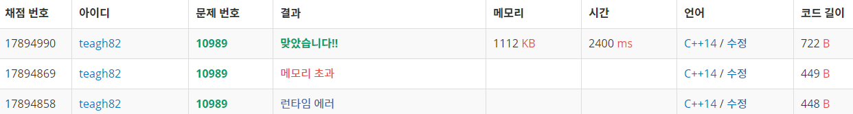 단순한 정렬문제지만 메모리 초과 때문에 고민을 했던 문제이다.